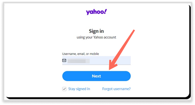 Ange ditt användarnamn och lösenord och klicka sedan på "Nästa.” Om du använder en kontonyckel, skickar Yahoo ett sms till din telefon för autentisering.