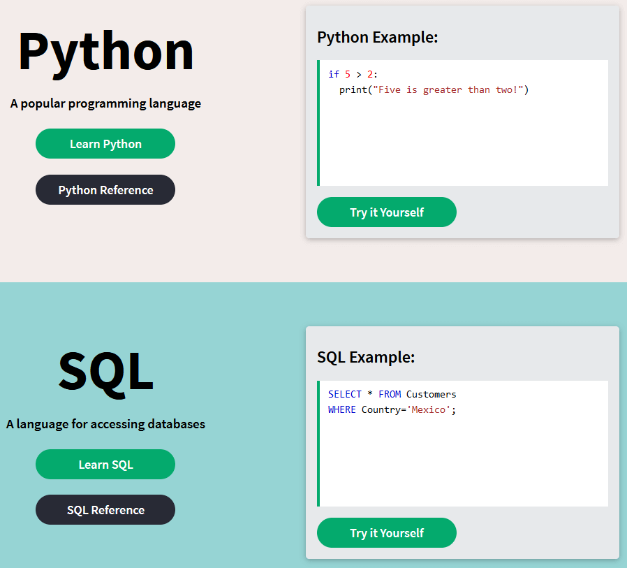 W3Schools är en av de mest populära gratis kodningsresurserna där ute. Du hittar handledningar för de vanligaste programmeringsspråken och du behöver inte ens ett konto. Du hittar också de bästa textbaserade handledningarna som kommer med korta men tydliga förklaringar följt av kodexempel, och du kan testa dig själv med övningar och frågesporter.