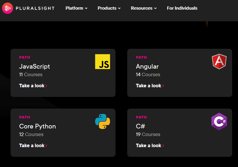 Pluralsight är en lärplattform som Udemy och Coursera men den fokuserar bara på tekniska färdigheter. Den erbjuder dig alla IT-kurser du kan tänka dig, men du kan också välja en förinställd inlärningsväg. Inlärningsvägen kommer att lära dig en viss färdighet, som att koda i Python, från början till slut.