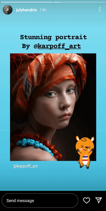 När du hittar en annan kreatör på Instagram som inspirerar dig, överväg att ta kontakt med dem. Om du är en artist, hitta en annan artist med liknande stil och marknadsföra dem på din sida. I sin tur kan just den här artisten ge en shout-out till dig och utöka din publik till sitt nätverk.
