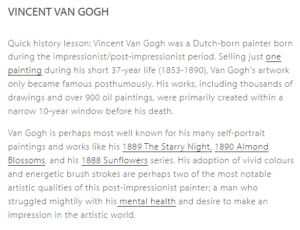 Förutom de vackra designerna delar Basic Apple Guy också lite bakgrund om Vincent Van Gogh, inklusive det faktum att han bara sålde en målning under sin livstid och det var inte förrän efter hans död som hans verk fick erkännande och beundran.