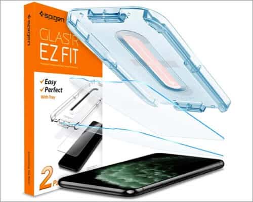 Spigen är ett av de mest välkända varumärkena för iPhone-tillbehör som fodral och kameralinsskydd. Detta skärmskydd av härdat glas är inneslutet i ett hölje som fungerar som en installationsenhet och skyddar glaset tills du är redo att använda det.