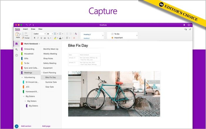 Du kan skapa avsnitt och sidor och lägga till tabeller, bilder, ljudinspelningar, mötesdetaljer eller klistermärken. Funktionerna slutar inte där. Du kan till och med markera anteckningar som du inte får missa med att göra-taggar för att ligga steget före och flagga frågor att ta upp under mötet. Vidare kan du synkronisera dina anteckningar till molnet för att komma åt dem var som helst.