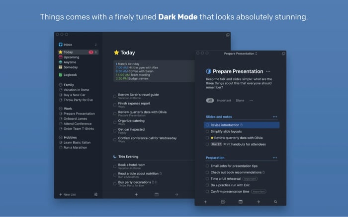Appen har ett enkelt användargränssnitt och liknar Things 3, förutom appens färgkod. Liksom Things 3 låter appen dig ställa in prioriteringar, skicka påminnelser om deadline och till och med använda Siri, Today-widgeten, Dela uppgifter via e-post, etc., på Mac.