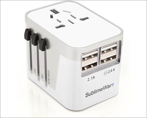 SublimeWares reseadapter är en enhet i ett stycke som kan slå många USB-reseadaptrar som finns i många delar. Du kan ladda fyra enheter – två smartphones, en surfplatta och en kamera. Produkten är kompatibel med alla avancerade enheter som iPhone 11 Pro Max, Samsung Galaxy S10 Plus, OnePlus 7 Pro, Huawei, etc.