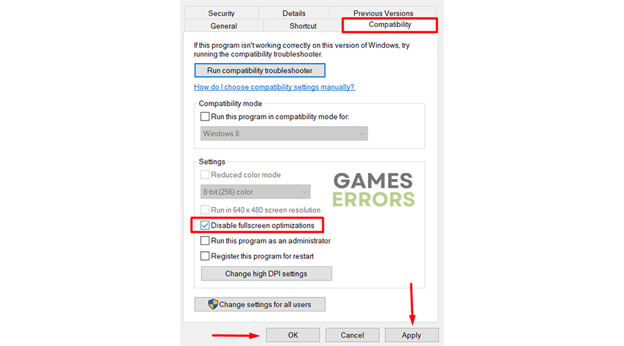 - VäljKompatibilitetfliken och klicka på kryssa i rutan bredvidInaktivera helskärmsoptimeringar.