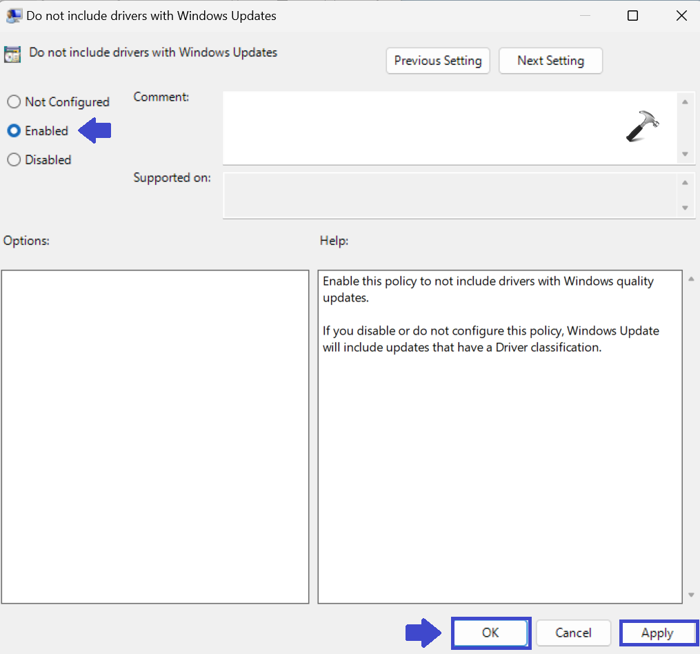 Välj "Aktiverad" för att aktivera "Inkludera inte drivrutin med Windows Update".