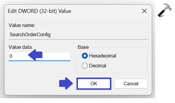 3. Dubbelklicka nu på registernyckeln "SearchOrderConfig". Uppmaningsrutan visas.