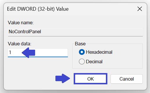 Högerklicka på Explorer => Nytt => DWORD (32-bitars) värde. En promptruta visas. Skriv nu NoControlPanel och klicka på OK.