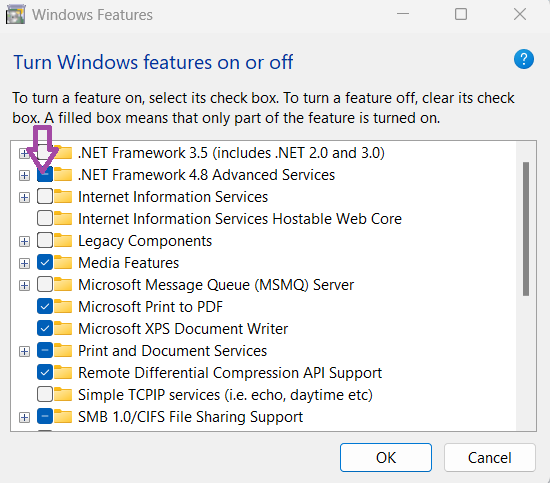 - Välja bort.NET Framework 4.8 Advanced Serviceslåda. (det kan vara .NET Framework 4.6 eller högre än så) och klicka på OK.