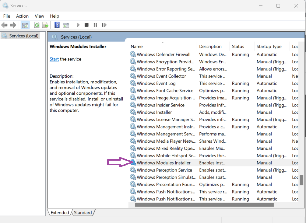 - Nästa, ta reda på detWindows Modules Installeroch högerklicka sedan för att väljaStarta om.