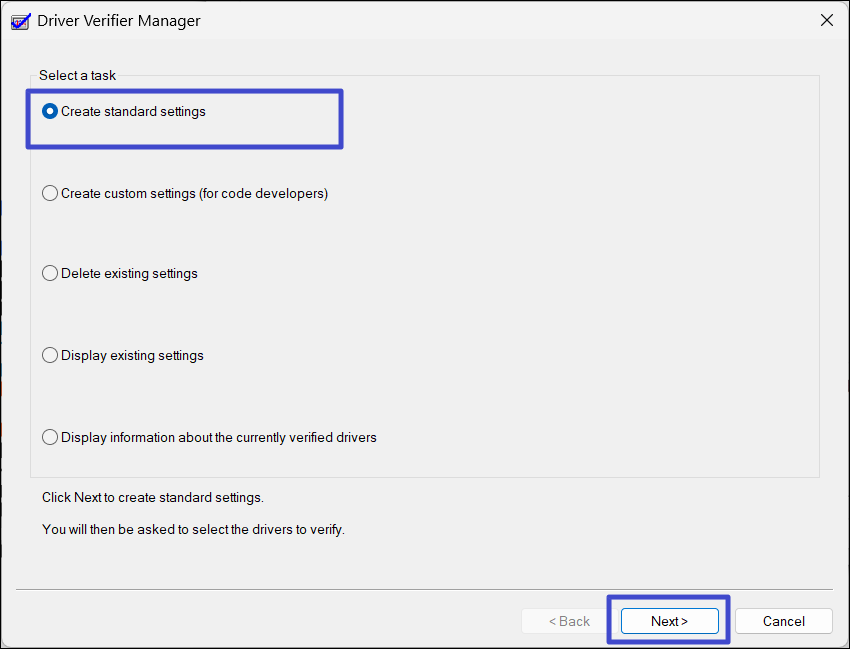 2. I Driver Verifier Manager, välj "Skapa standardinställningar", och klicka på "Nästa“.