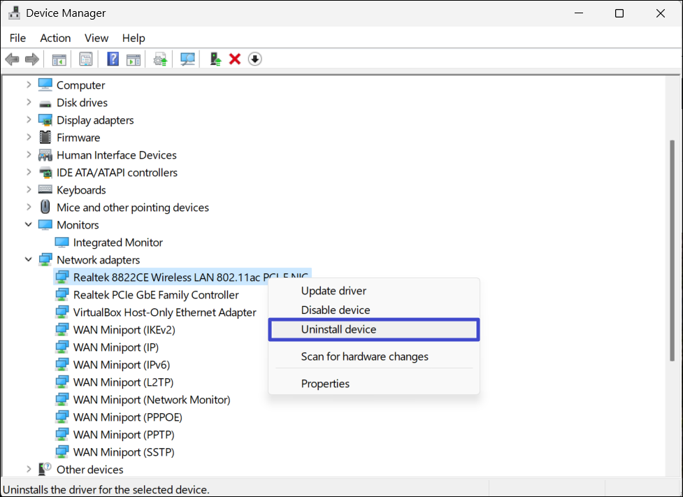 När du har hittat den felaktiga drivrutinen, avinstallera drivrutinen helt från Enhetshanteraren. Ladda sedan ner och installera den senaste drivrutinen för den enheten från tillverkarens webbplats. Detta bör fixa BSOD-felet och felmeddelandet "Datorn har startat om från en buggkontroll".
