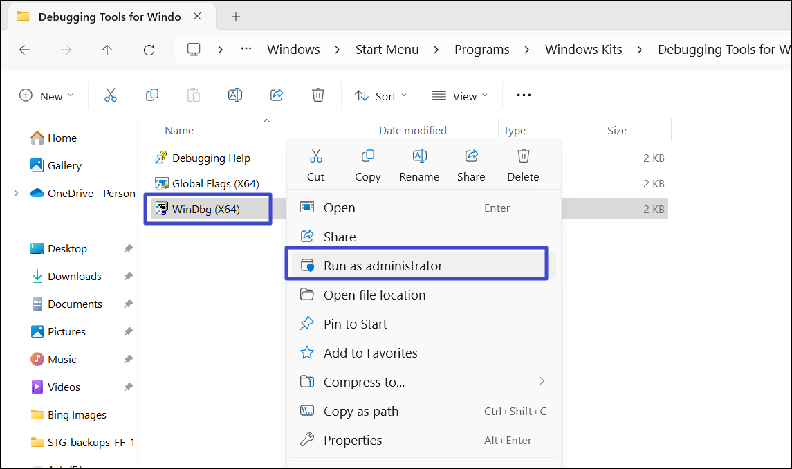 8. Inuti den mappen högerklickar du påWinDbg (x64)eller(x86)program och välj "Kör som administratör“.