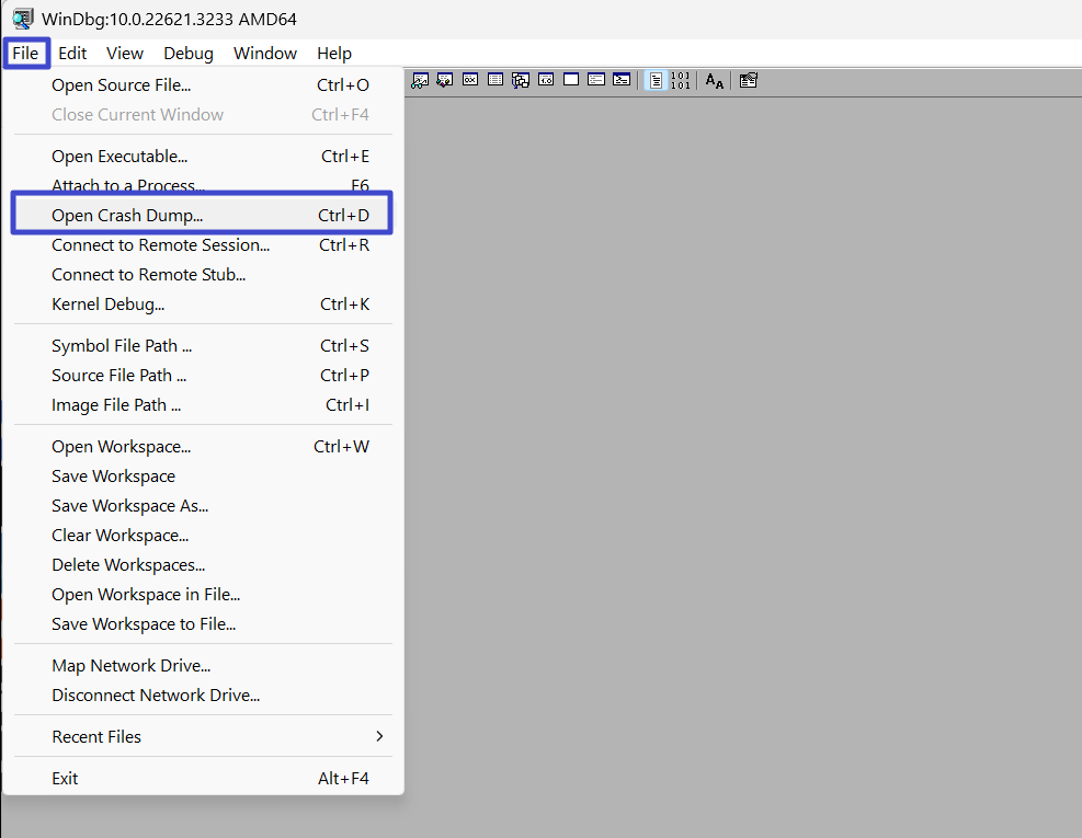 9. Klicka på "Fil"-menyn och välj "Öppna Crash Dump“.