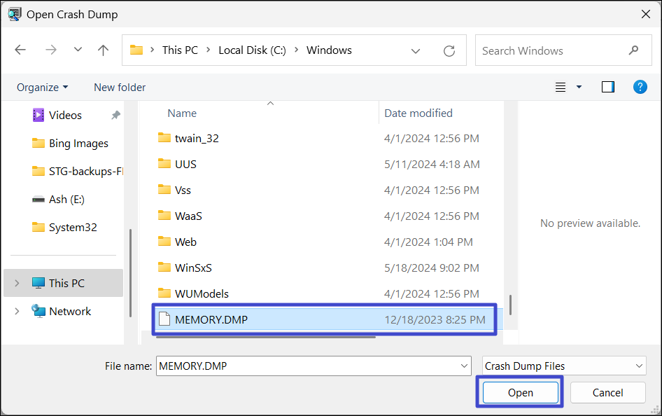 10. Navigera till "Lokal disk (C:) > Windows"och välj "MEMORY.DMP” fil.Klicka sedan på "Öppna".