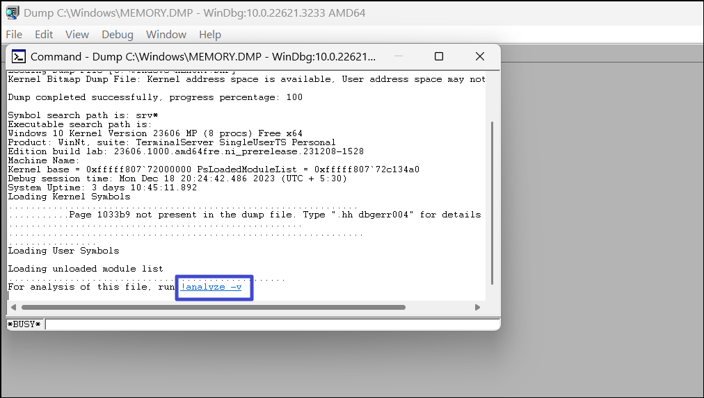 12. Klicka på "!analysera -v"för att se mer felsökningsinformation.
