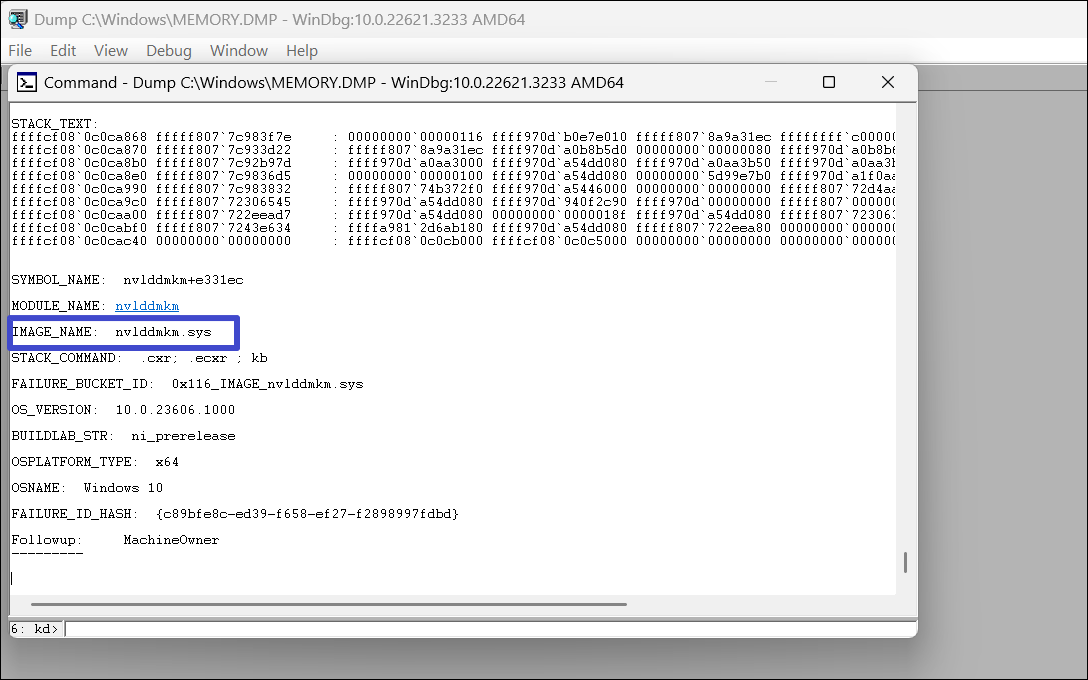 13. Scrolla ner till botten av minidumpinformationen och leta reda på avsnittet märkt "IMAGE_NAME” eller liknande. Notera filnamnet bredvidIMAGE_NAME. I mitt fall var det detnvlddmkm.sys.