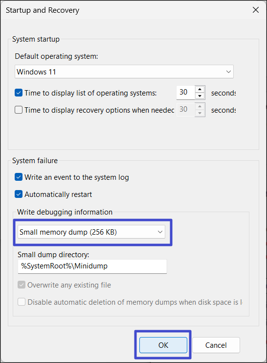 3. UnderSkriv felsökningsinformation, välj "Liten minnesdump (256 KB)", och klicka på "OK“.