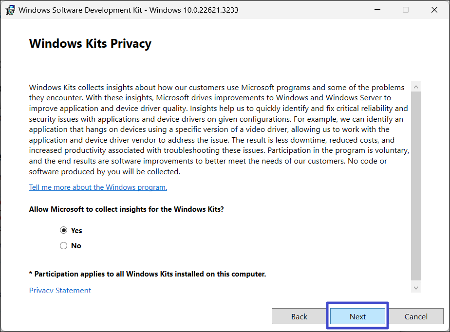 2. Kör installationsprogrammet för Windows SDK och klicka på "Nästa“.