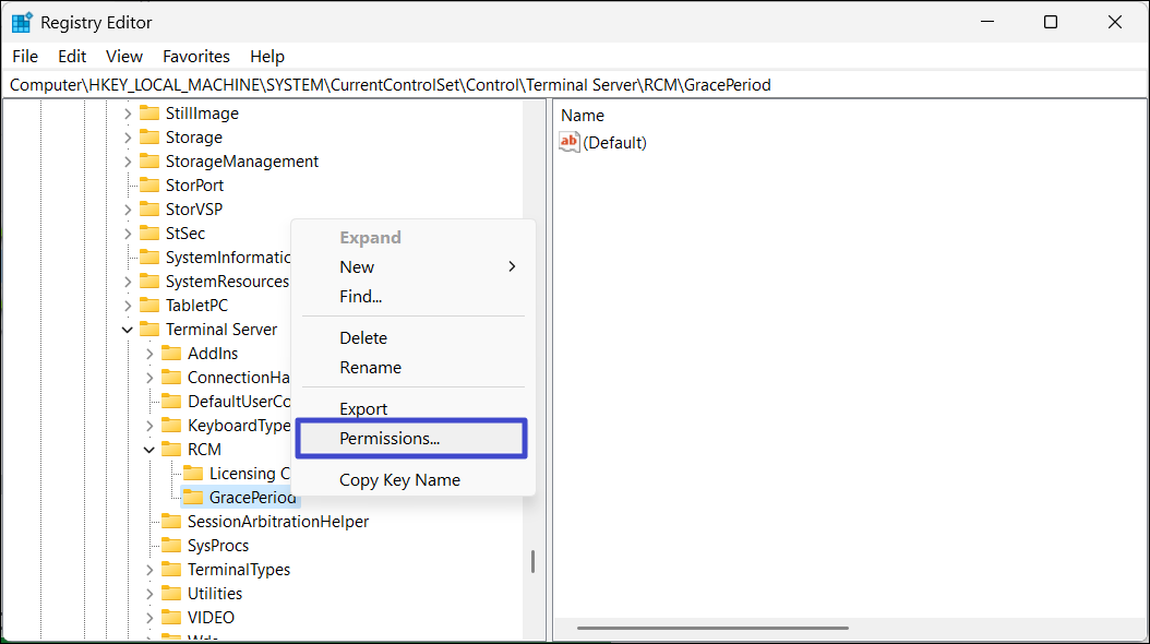 5. Under RCM-mappen hittar du "GracePeriod"-tangenten. Innan du kan ändra den här nyckeln måste du ta äganderätten till den. För att göra det, högerklicka på nyckeln och välj "Behörigheter“.