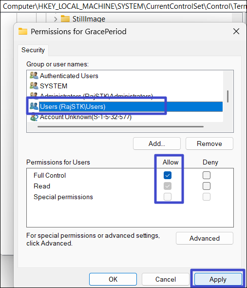 6. Välj användarnamnet och markera "Full kontroll". Klicka sedan på "Tillämpas“.