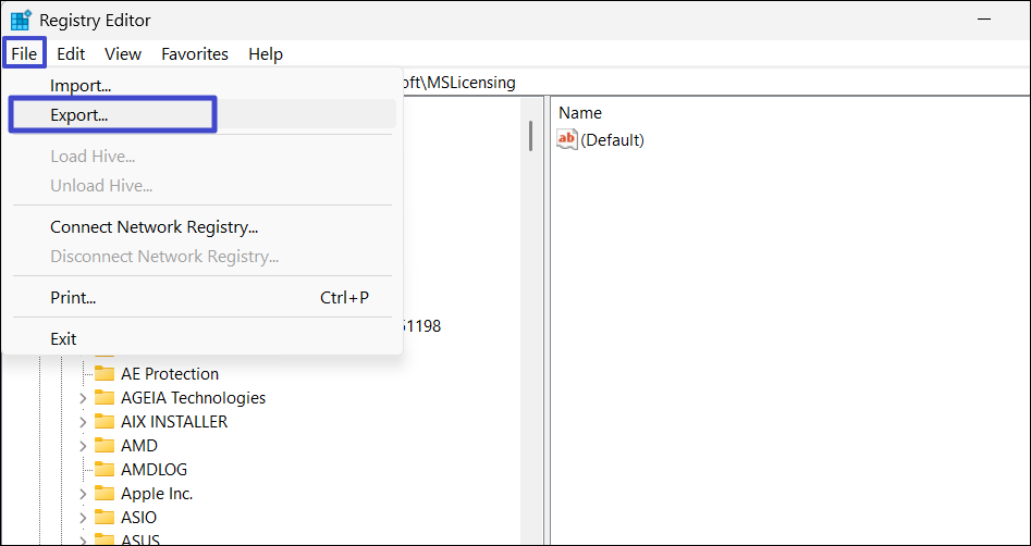 2. Det rekommenderas alltid att säkerhetskopiera ditt register innan du ändrar det. För att göra det, klicka på "Fil"-menyn och välj "Exportera“.