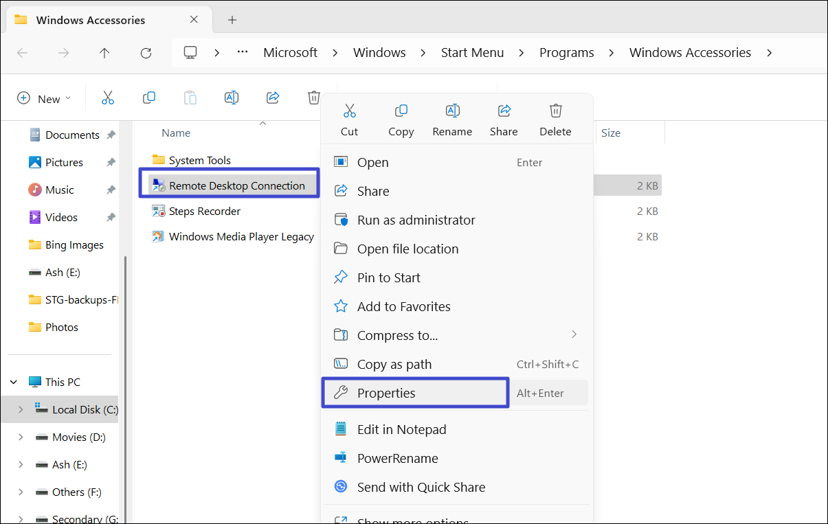 2. Högerklicka på "Anslutning till fjärrskrivbord" genväg och välj "Egenskaper“.