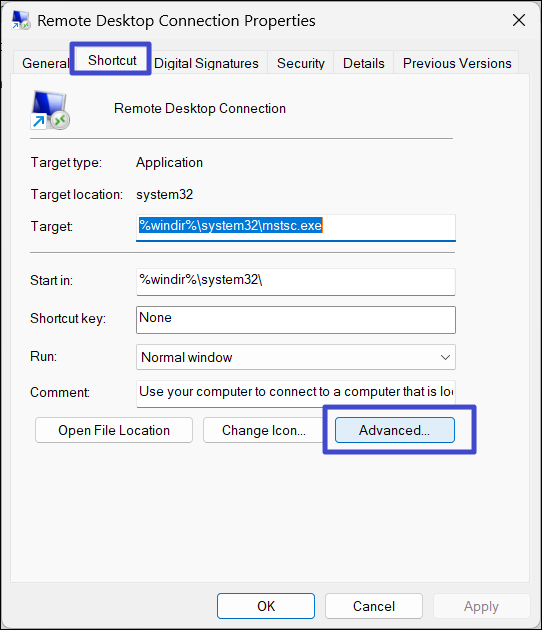 3. På fliken Genväg klickar du på "Avancerad“.