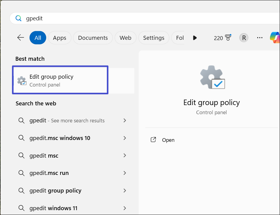 1. Öppna Start-menyn, skriv "gpedit" eller "grupppolicyredigerare" och välj det bästa resultatet.