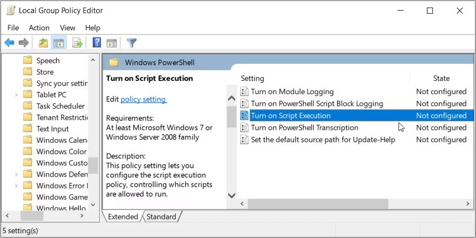 Ändring av exekveringspolicyn görs också enkelt via Local Group Policy Editor (LGPE). Du kan använda det här verktyget för att ändra olika systeminställningar eller lösa ett stort antal PC-problem. Så här ändrar du LGPE:s exekveringspolicy: