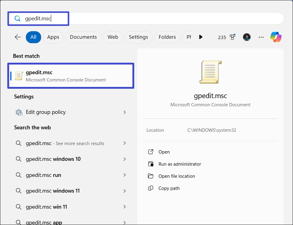 1. Öppna Group Policy Editor genom att söka efter "gpedit.msc” i Start-menyn.