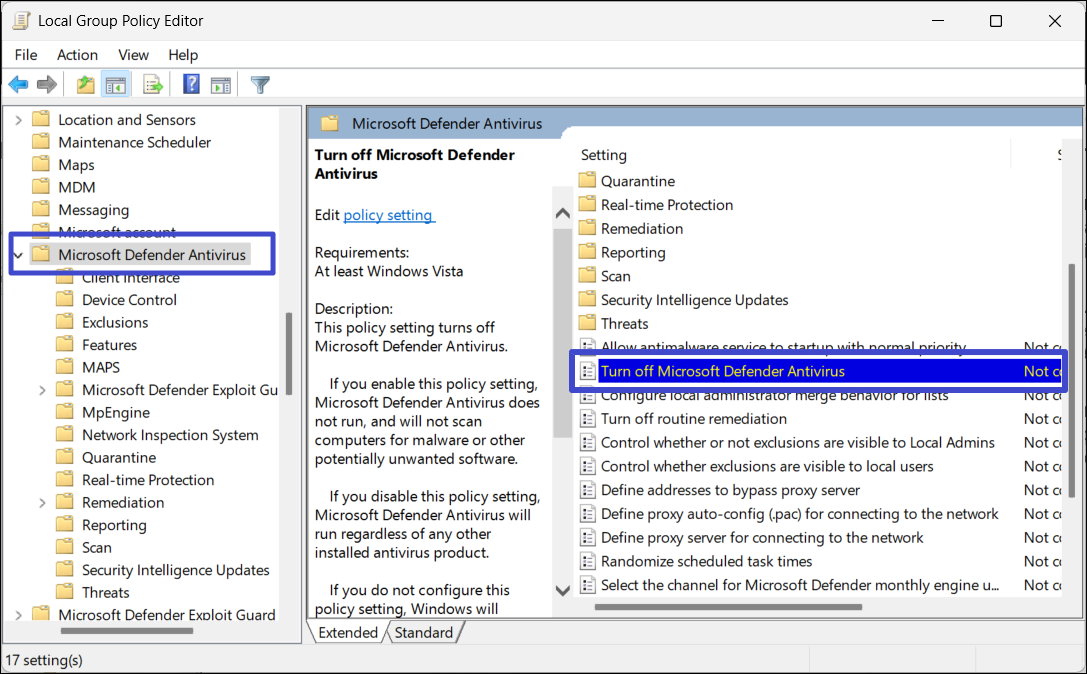 Datorkonfiguration > Administrativa mallar > Windows-komponenter > Microsoft Defender Antivirus