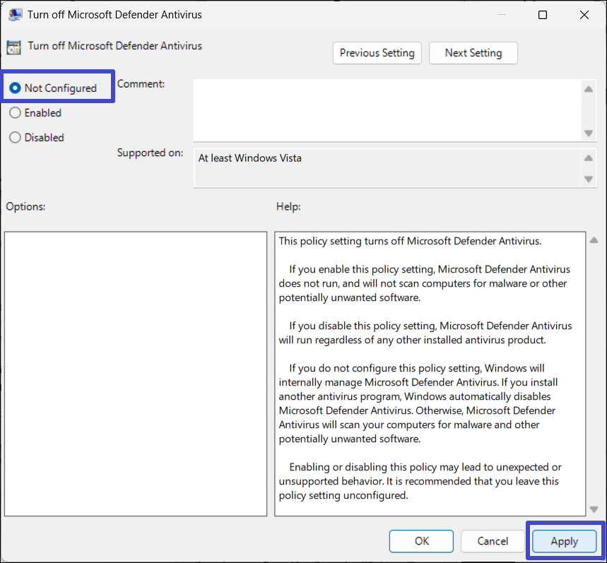 4. Ställ in inställningarna på "Ej konfigurerad" och klicka på "Tillämpas“.