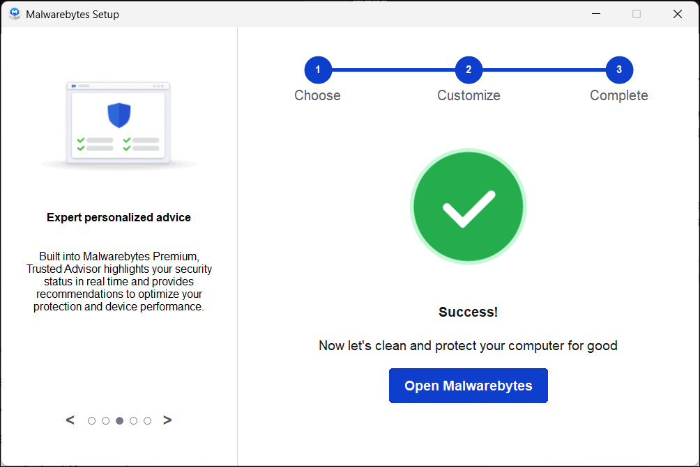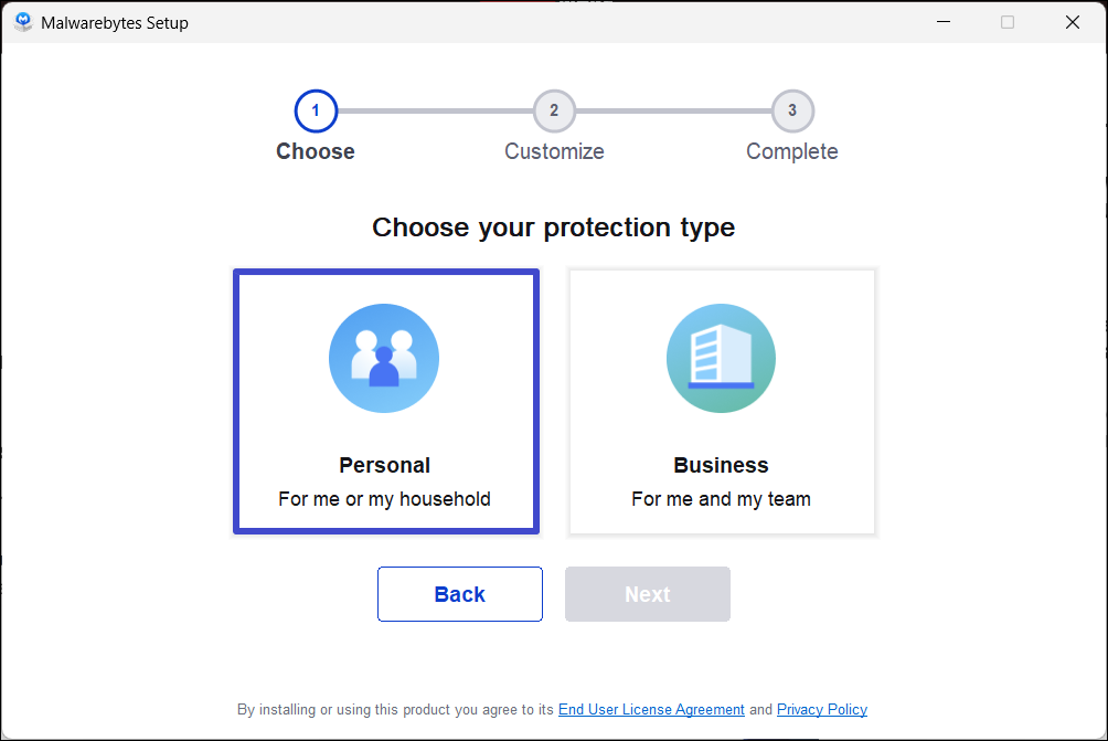 2. Kör den nedladdade installationsfilen (MBSetup.exe) och följ instruktionerna på skärmen för att installera appen. När du installerar se till att du väljer "Personlig” använd vid produktionstypsteget.
