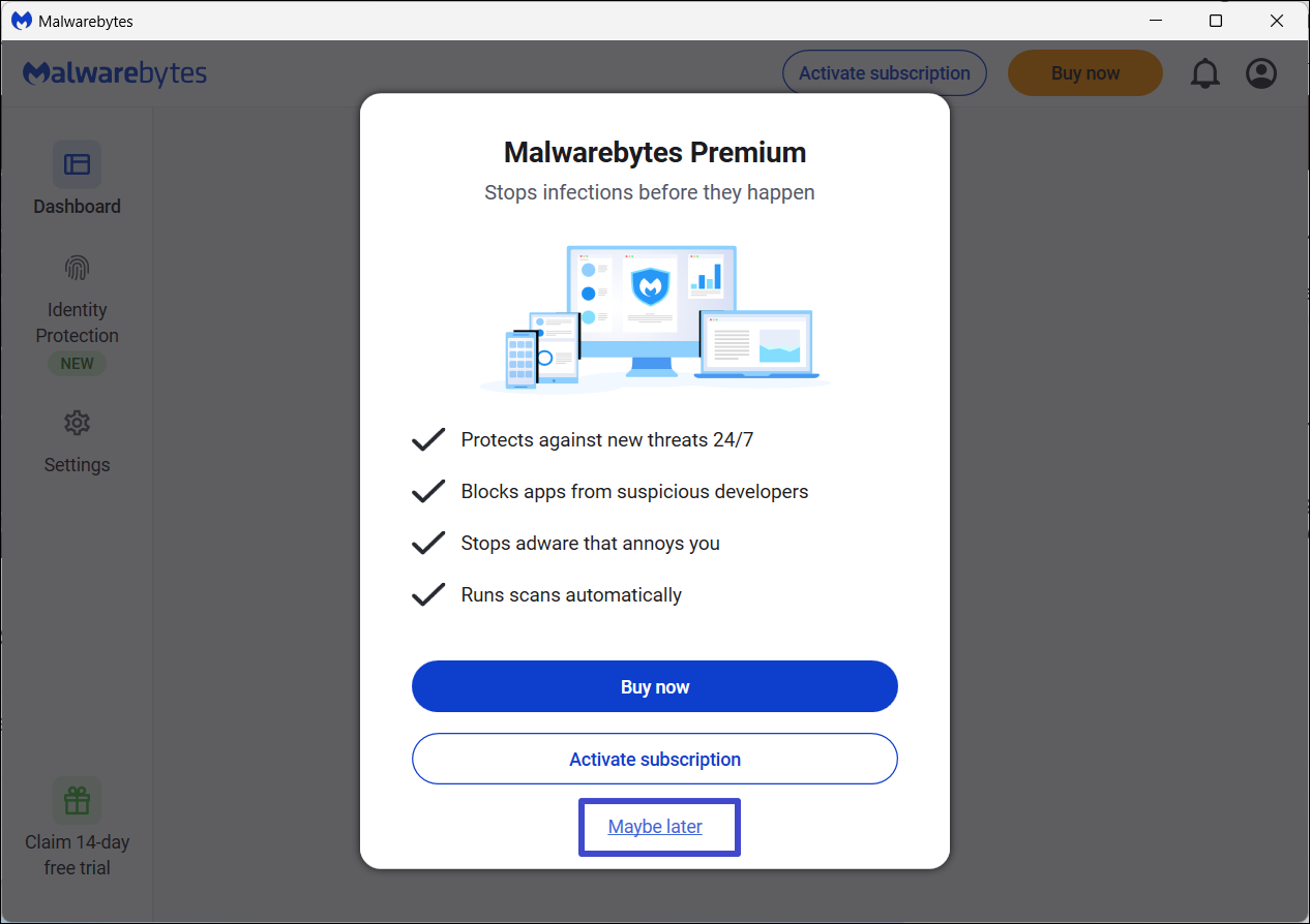 Det "Oväntade felet" kan också uppstå om någon skadlig programvara stör Windows säkerhetsfunktioner. Eftersom du inte kan använda Windows Security för att söka efter skadlig programvara i det här fallet, prova att använda ett gratis antivirusprogram som Malwarebytes.