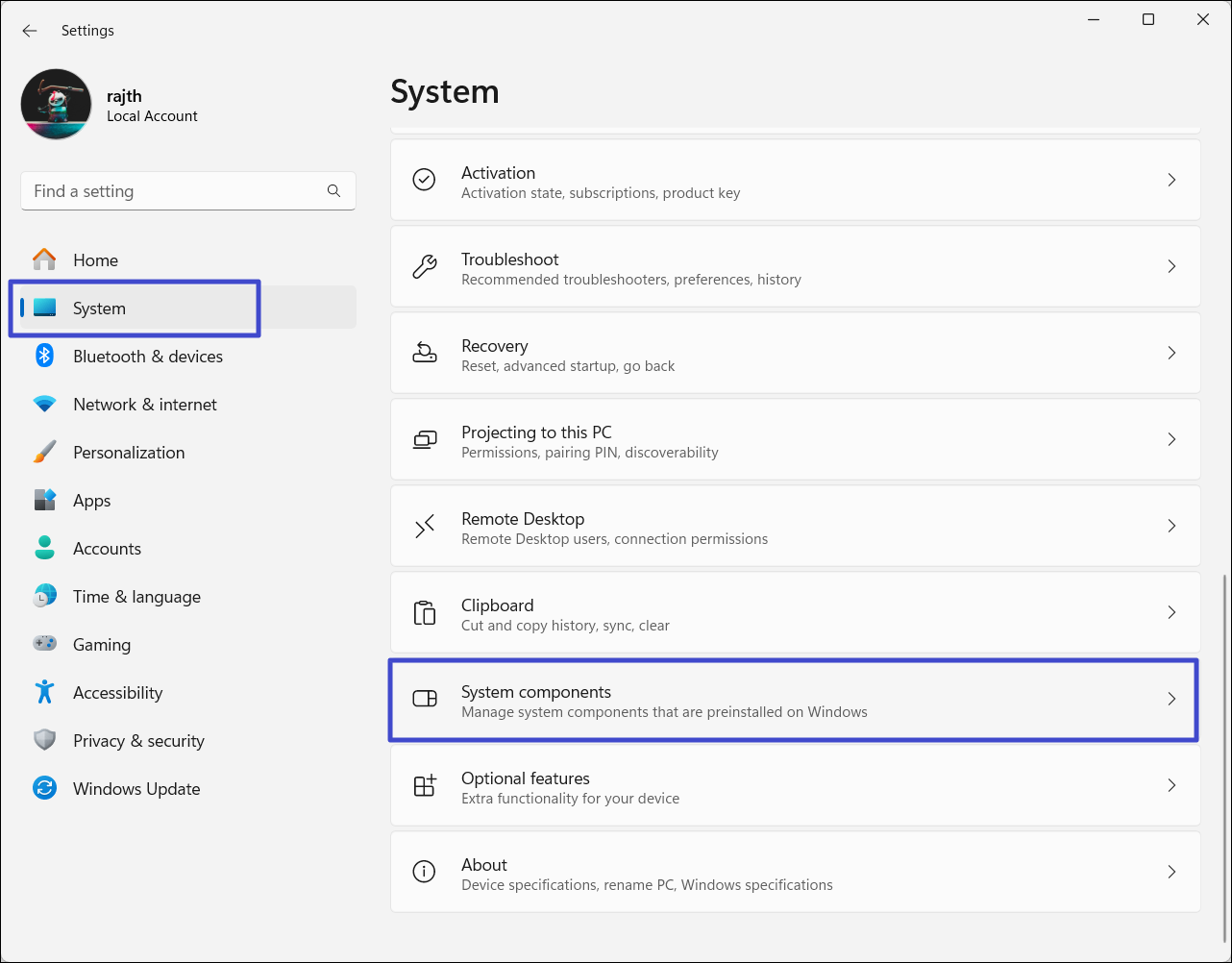1. Öppna appen Windows Inställningar, gå till "System"-fliken och klicka på "Systemkomponenter".