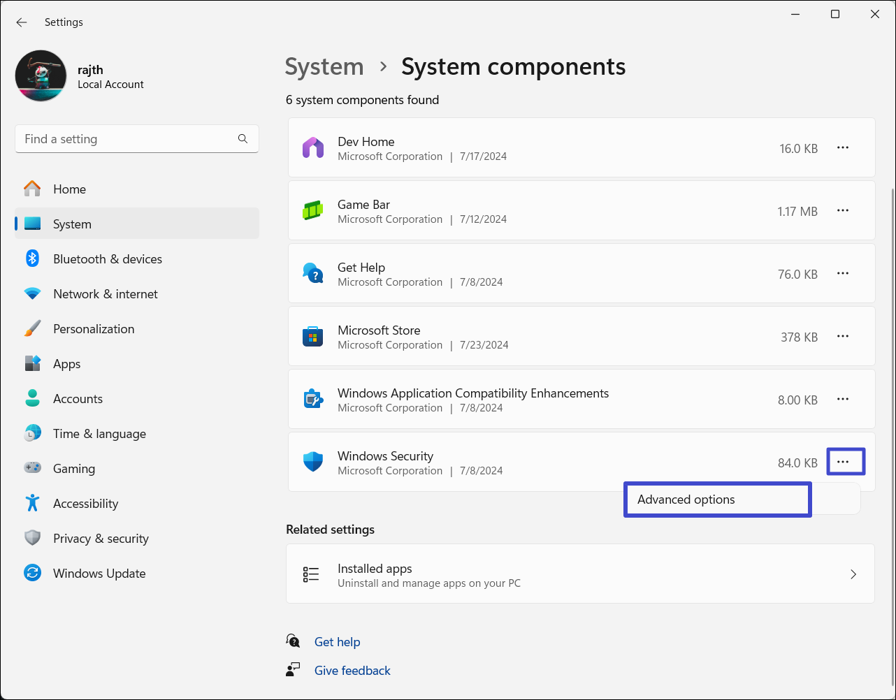 2. Klicka påtre prickarbredvid "Windows säkerhet" och välj "Avancerade alternativ“.