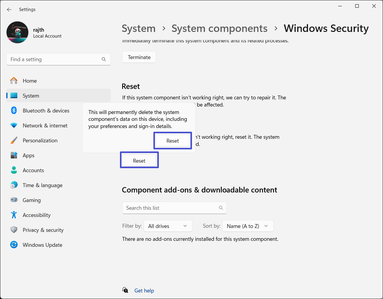 3. Under avsnittet Återställ klickar du på "Återställa"knappen och klicka på "Återställa” igen i prompten.