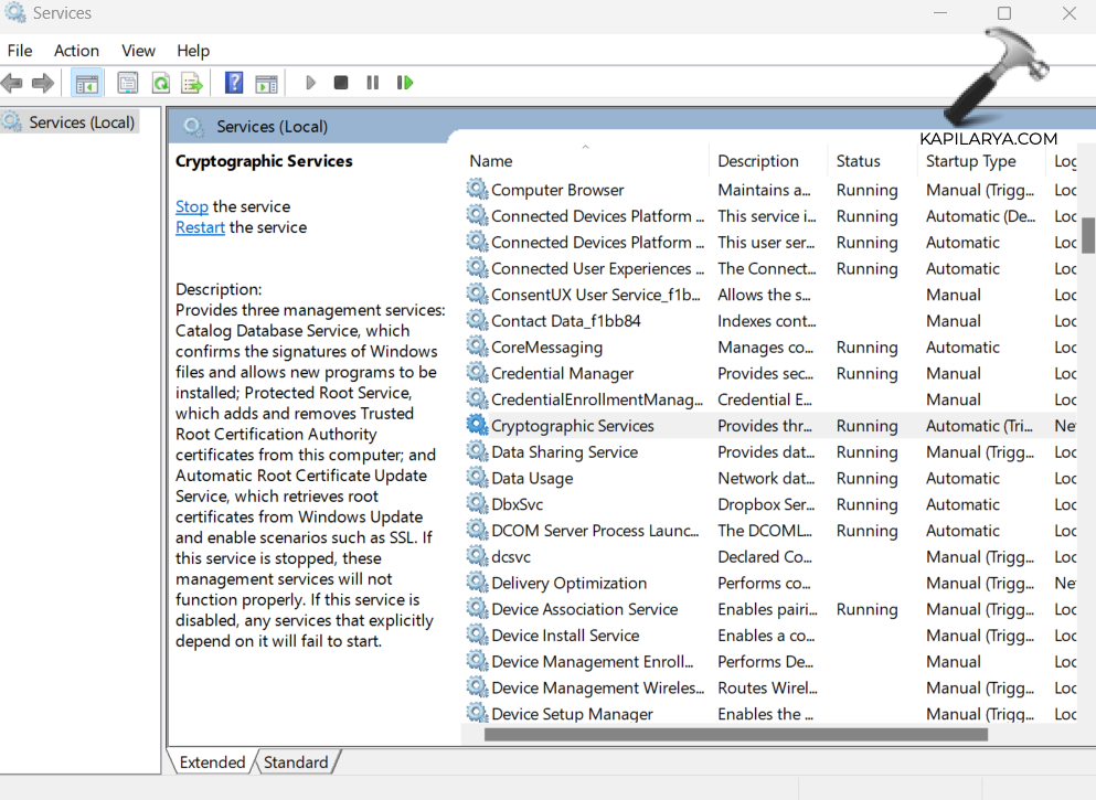 2. Högerklicka sedan på "Kryptografiska tjänster" och välj "Stopp".