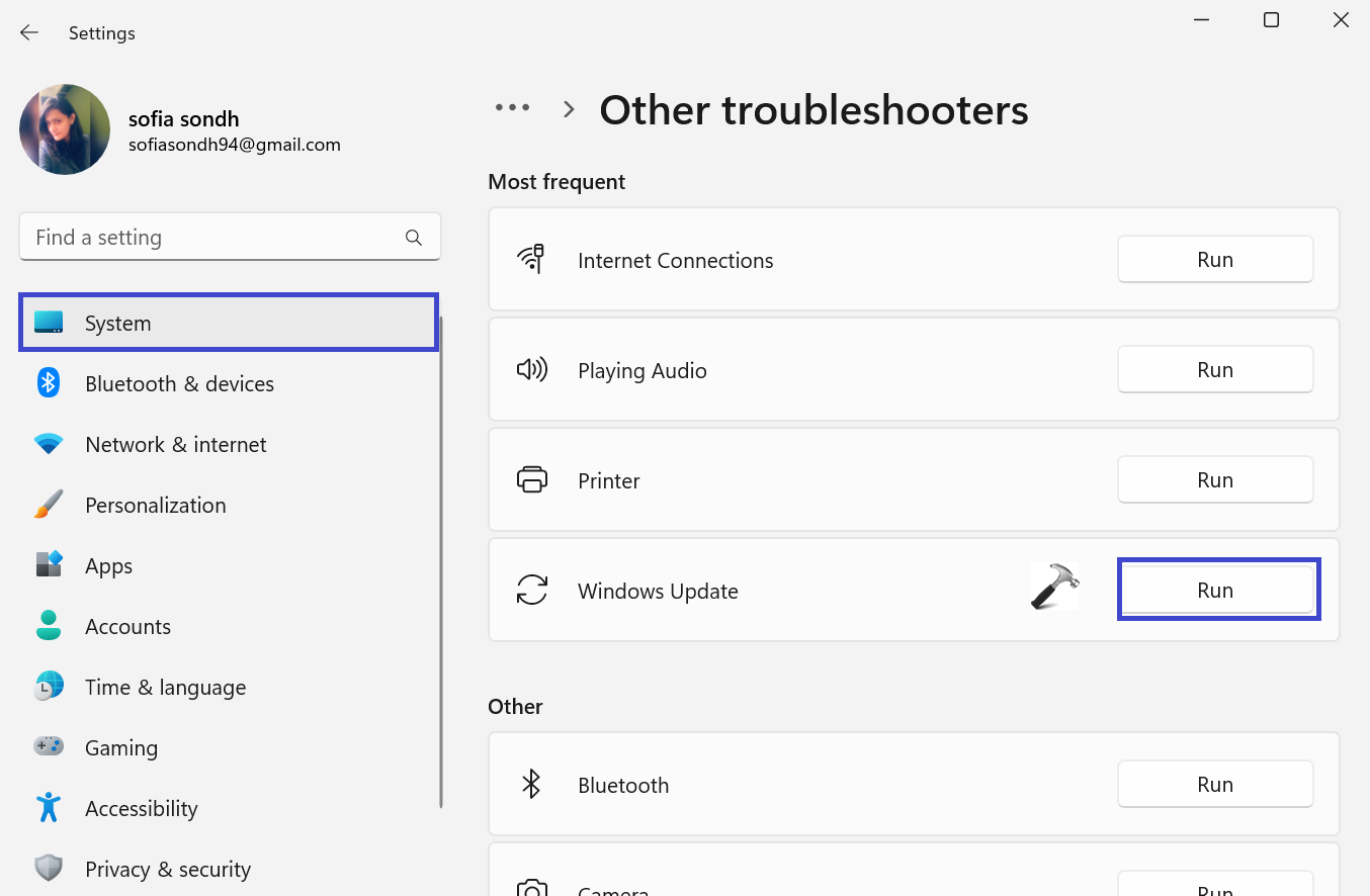 4. I den högra panelen klickar du på "Kör" bredvid Windows.