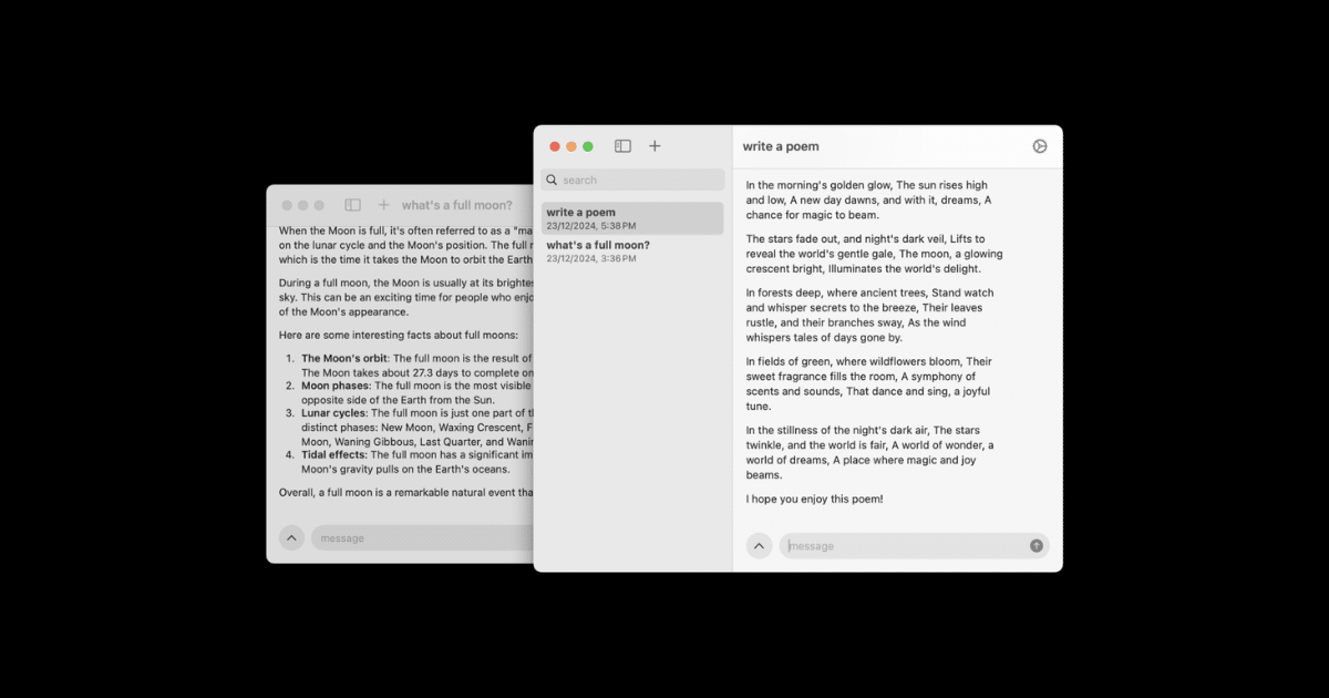 Istället för att förlita sig på internetanslutningar kör fullmoon AI-modeller lokalt på Apple silicon, vilket förbättrar hastigheten och håller konversationsdata privat. Appen fungerar helt offline på iPhone, iPad, Mac och Vision Pro, och den kräver iOS17.6, iPadOS17.6, macOS14.0 eller visionOS2.0 eller senare.
