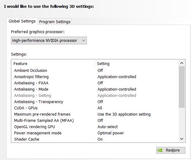 - VäljGlobala inställningartabb och väljHögpresterande NVIDIA-processorfrån rullgardinsmenyn Önskad grafikprocessor.