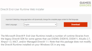 - Gå tillMicrosofts webbplatsoch ladda ner den senaste DirectX-versionen. Nedladdningslänken finns påDirectX nedladdningssida.