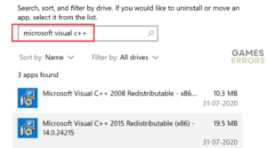 - Hitta "Microsoft Visual C++" i fönstret Appar och funktioner och klicka på det.Avinstallera varje paket.
