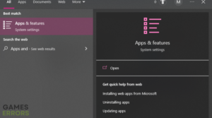 - Gå till Windows sökfält, skriv och välj"Appar och funktioner" från sökresultaten.