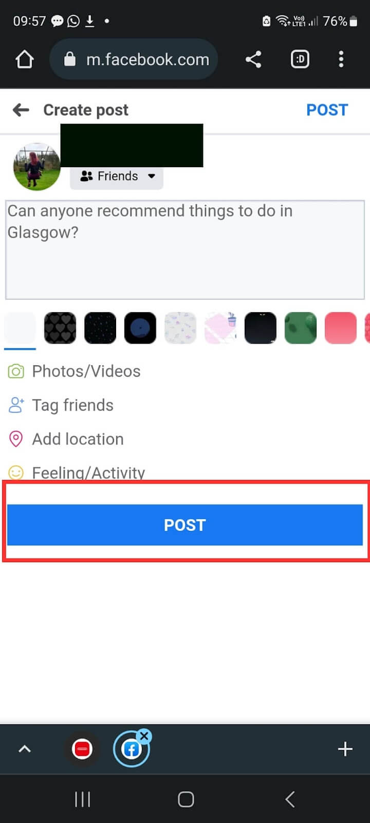 - Tryck påPostaknappen längst upp till höger för att lägga upp din rekommendationsförfrågan på din Facebook-vägg.
