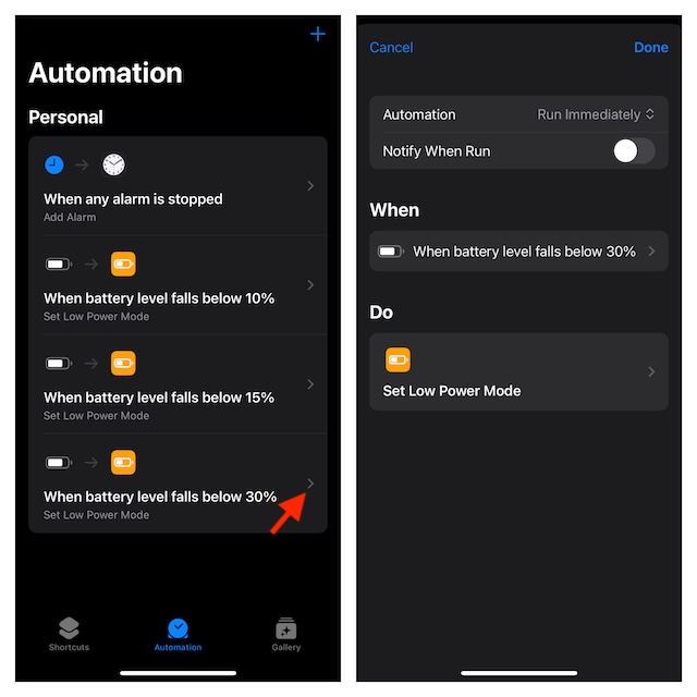 - Gå till appen Genvägar på din iPhone -> Fliken Automation -> tryck på den lilla framåtpilen bredvid automatiseringen i fråga.