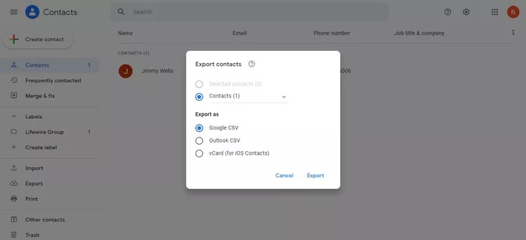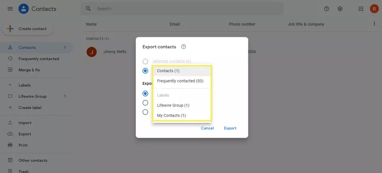 2.VäljaExporterafrån menyn till vänster och väljKontakterradioknappen på nästa uppmaning.