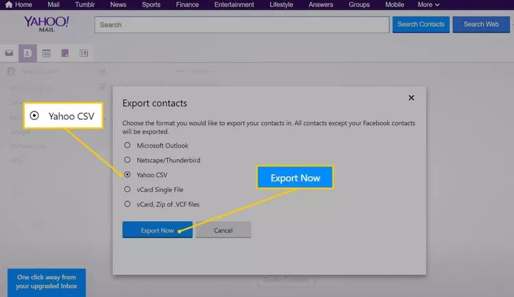 4.VäljYahoo CSVradioknapp för att exportera dina kontakter i en .csv-fil och klicka sedanExportera nu.